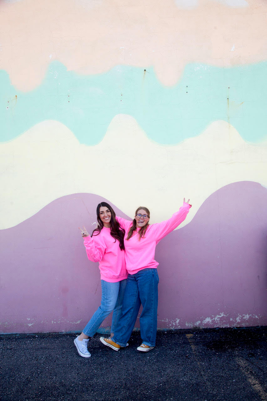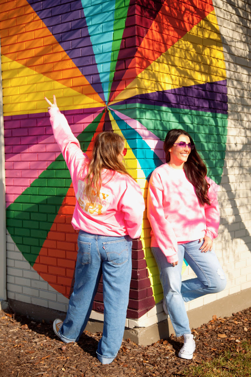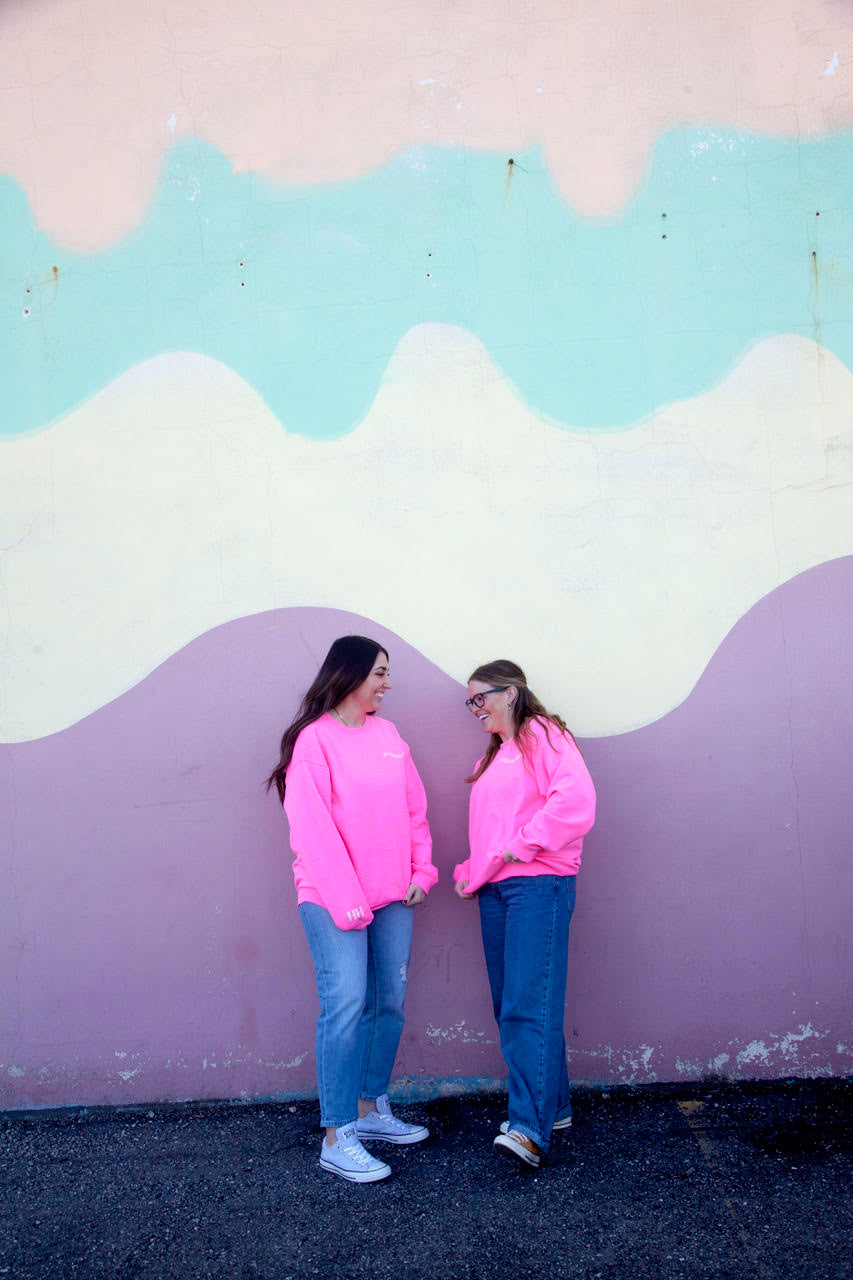 Designed on a pink colored Gildan crewneck sweatshirt. 50% cotton 50% Polyester. Unisex sizing from XS to 3X.